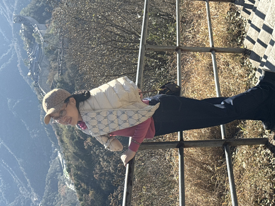 A woman stands on outdoor steps adjacent to a dark metal railing, positioned in front of the Great Wall of China within Yanqing District