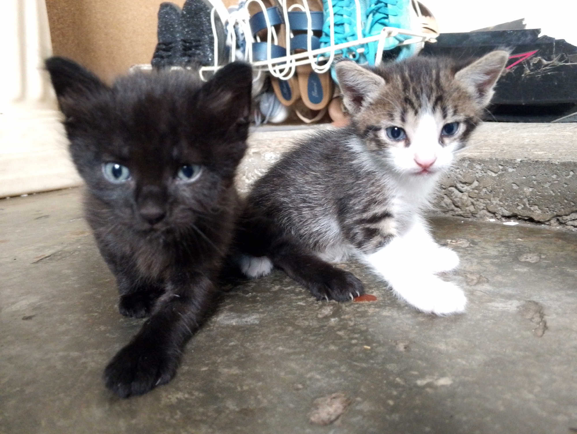 Two kittens are sitting on a concrete surface. The kitten on the left is black, and the kitten on the right is gray and white. In the background, there is a collection of shoes on a rack. The location is outdoors, possibly a patio or porch. There is no evidence in the image to establish the specific location in San Carlos, Venezuela.