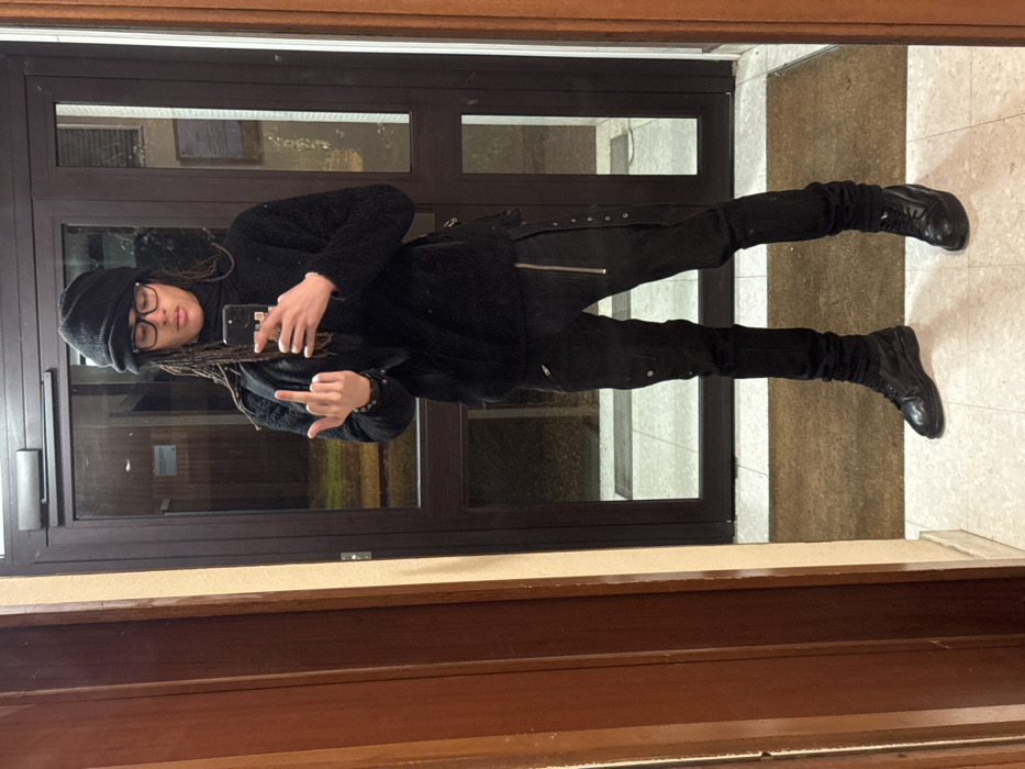 A person with dreadlocks, glasses, and a black beanie poses in front of a glass door. Dressed in a black top, pants, and boots, they hold a phone in one hand, seemingly taking a selfie. The other hand is raised, displaying the middle finger. The background is blurred, suggesting an outdoor or entryway setting. The image is rotated 90 degrees counter-clockwise.