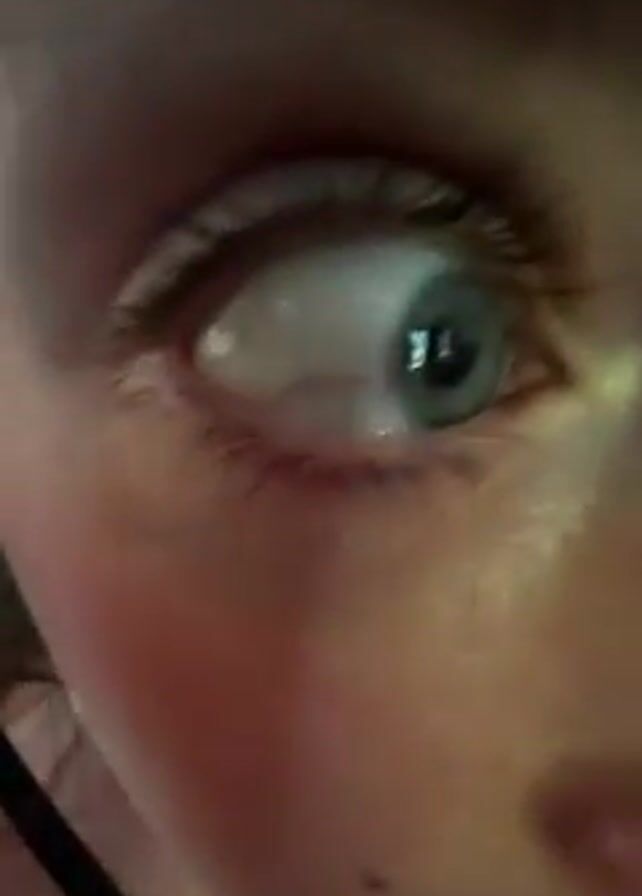 A close-up video shows a person's face with a focus on their left eye. The eye is light colored, possibly blue or gray, and the eyebrow is light brown. The person's skin appears fair, and there is a hint of pink blush on their cheek. The camera is close enough to show skin pores. A black strap is visible near the lower left corner of the frame, suggesting clothing. The person is speaking in Hebrew.