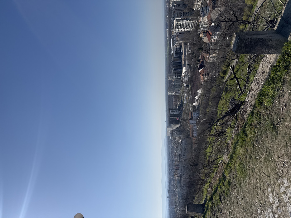 The image displays a panoramic view of the city of Plovdiv, Bulgaria, observed from an elevated position, likely one of its historical hills such as Nebet Tepe or Sahat Tepe. The scene is illuminated by bright sunlight under a clear, pale blue sky, with a visible sun flare in the upper left quadrant. In the immediate foreground, a grassy slope descends, covered with patches of green and dry brown vegetation. Sparse, leafless tree branches and brush are scattered across this uneven terrain. Two weathered, light-grey concrete or stone posts frame the lower edge of the foreground: one partially visible in the lower-left, and a distinct rectangular pillar in the lower-right. A rough, light-colored stone retaining wall or path edge runs horizontally through the lower portion of the frame, delineating the elevated viewpoint. The midground and background present the sprawling urban landscape of Plovdiv. A diverse mix of buildings is visible, ranging from older structures with terracotta roofs to modern, multi-story residential and commercial complexes, including several prominent dark-colored, tall buildings towards the right-center. A distinct area resembling a cemetery, characterized by numerous small, light-colored markers, is discernible in the mid-right section of the city below. Interspersed throughout the city are areas of green vegetation. In the far distance, hazy blue mountains or hills form the horizon line beneath the clear sky. No individuals, specific actions, or direct interactions are depicted in the scene.
