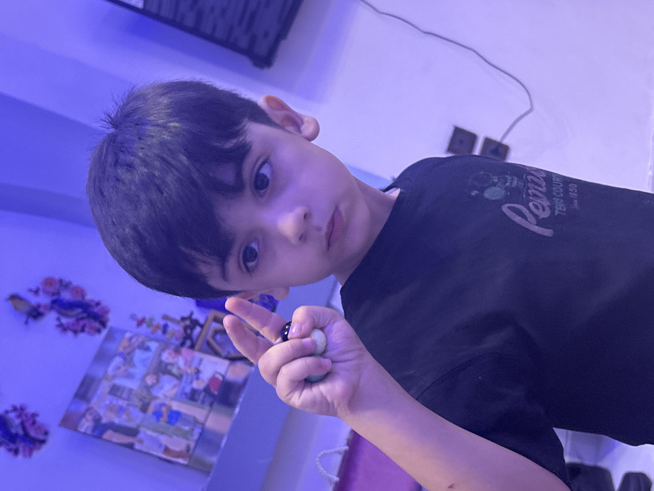 An indoor scene within Barza Municipality, Syria, depicts a young male child, approximately 4-7 years old, captured from the chest up. The environment is illuminated by a predominant blue-purple light source, casting a violet hue on surfaces. The child has dark, short hair, dark eyes, and a fair complexion, maintaining a neutral expression while looking towards the right side of the frame. He wears a black short-sleeved t-shirt with a light-colored graphic on the front, partially legible as "Perrie TENNIS COURT Since 1950" accompanied by a cartoon character illustration. His left hand is raised, with the index and middle fingers extended upward in a V-shape. Each of these three fingers (index, middle, and ring) is adorned with a small, spherical bead; a dark-colored bead is on the index finger, and lighter-colored beads are on the middle and ring fingers. The background is out of focus, revealing light-colored walls. On a shelf in the upper-left quadrant, a framed photo collage containing multiple images of individuals is visible, flanked by decorative purple floral or ornamental elements. Electrical outlets or switches and a dark cable are discernible on the right wall. A light-colored bag object is partially visible in the lower-left background.
