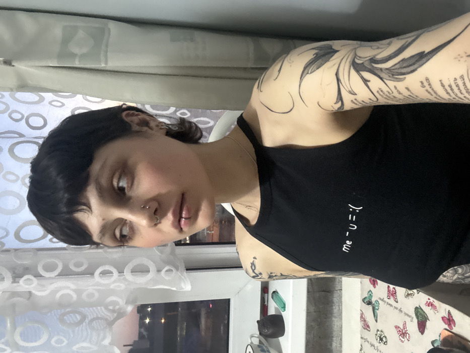 The image portrays a young adult female indoors, positioned to the left of a window, gazing to her right. She has short, dark hair with bangs, a septum piercing (hoop), a horizontal labret piercing, and multiple ear piercings visible on her right ear. Her arms are extensively covered with black ink tattoos; the visible portion of her left arm (viewer's right) displays Cyrillic script integrated with organic designs, while her right arm (viewer's left) features a floral or abstract pattern. She wears a black halter-neck top with the white text "me - u = :(" printed across the chest. The background on the left features a window, partially covered by sheer white curtains adorned with circular patterns. Through the window, an urban twilight scene is visible, showcasing a sky with soft orange and pink hues near the horizon transitioning to darker blue, dotted with distant city lights. A white window sill below holds a dark, stylized object, a translucent green item (possibly a lighter), and a portion of a white mug. Beneath the window sill, a light-colored surface with a multi-colored butterfly pattern is visible. The right side of the frame reveals a plain, light-colored wall. No specific architectural landmarks or identifying features are present in the image to determine a precise location within the city of Saint Petersburg, Russia.
