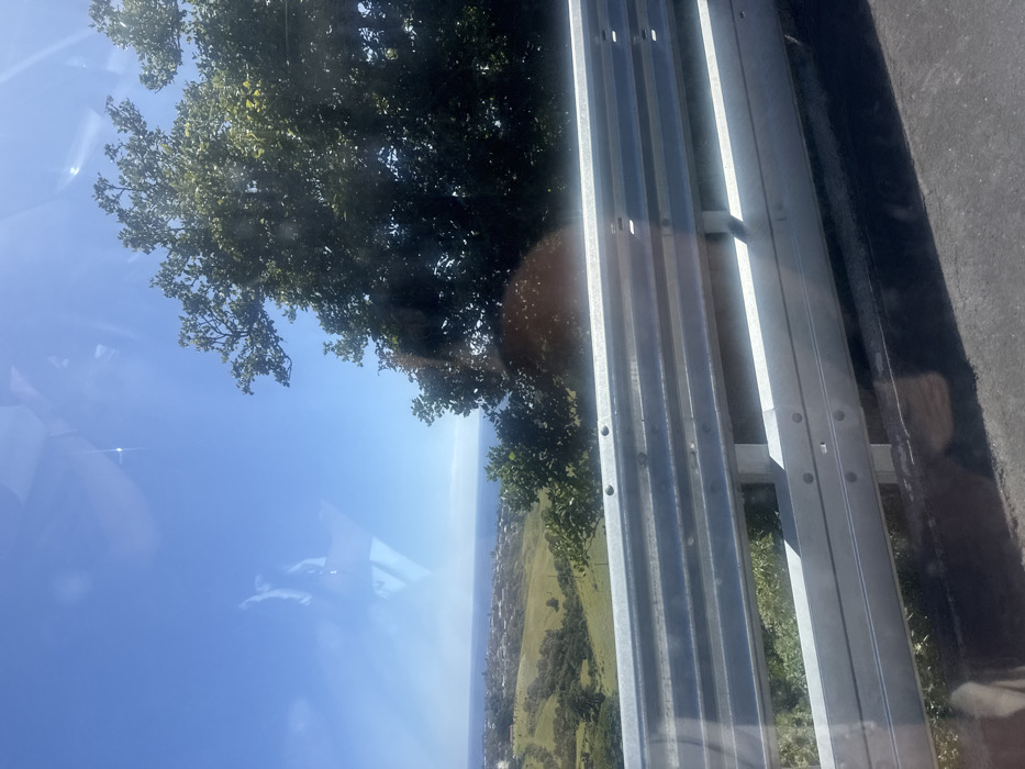 From a high vantage point, a scenic view unfolds. Below, a green field stretches, dotted with trees and hints of distant buildings. Beyond lies a serene body of water, meeting the clear blue sky. The edge of the observation point features a modern metal railing, adding a structured contrast to the natural landscape. A tree partially obscures the view from the top left, creating a sense of depth.