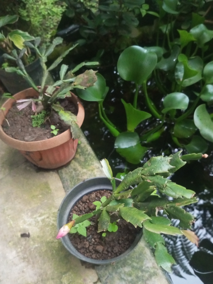 The image depicts an outdoor scene in Ciherang, Indonesia, centered on two potted plants positioned on a light grey concrete surface adjacent to a body of water. In the foreground, a dark grey plastic pot contains a Christmas cactus (Schlumbergera) with green segmented stems, exhibiting one prominent pink flower bud and small green weed growth within the soil. Directly behind and to the left, a terracotta-colored plastic pot holds a similar succulent, displaying green and some brownish segmented stems, also rooted in soil. To the right and rear of the potted plants, a dark water body is partially visible, densely covered by numerous green water hyacinth plants (Eichhornia crassipes) with rounded leaves. Further in the background, obscured by the water hyacinths, additional dense green foliage is present. No individuals, actions, or interactions are observed within the frame.
