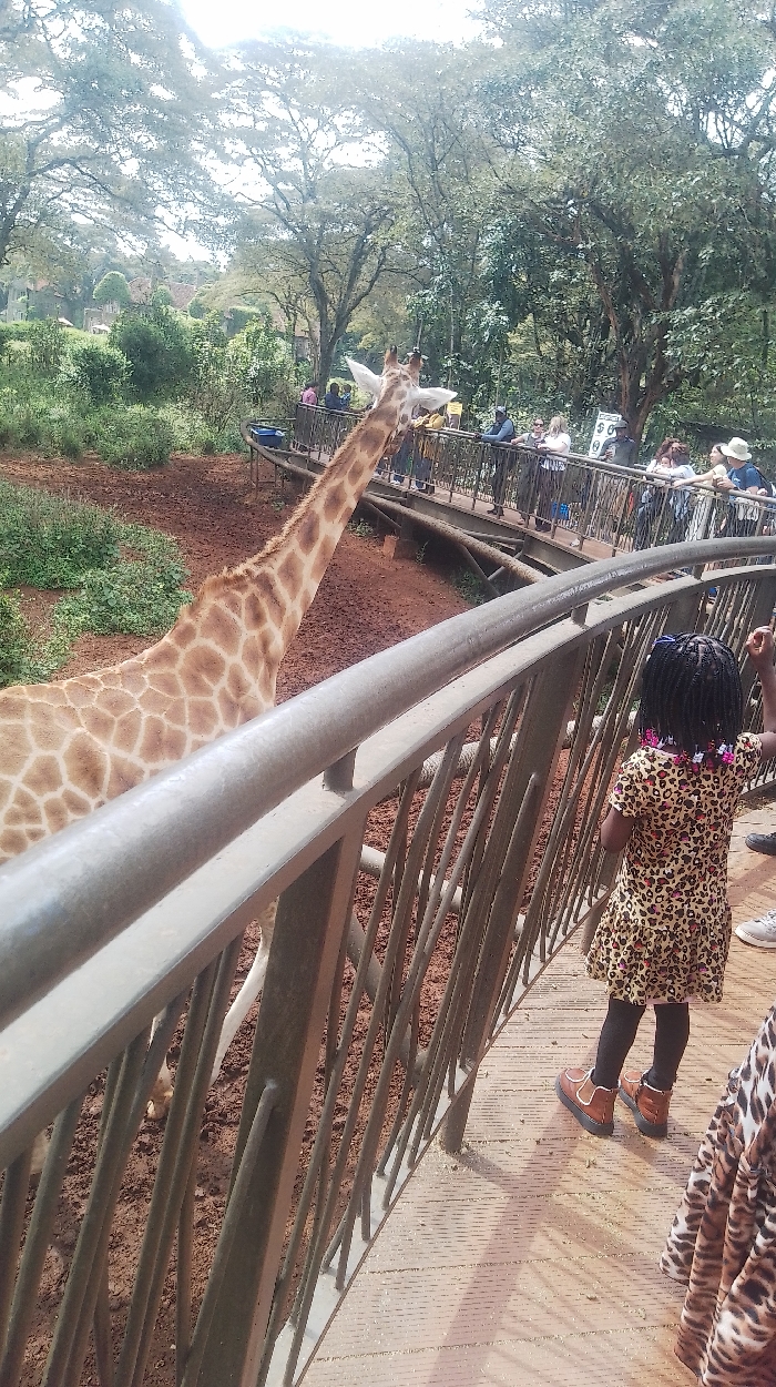 The image depicts an outdoor animal interaction scene at the Giraffe Centre in Nkaimurunya ward, Kenya