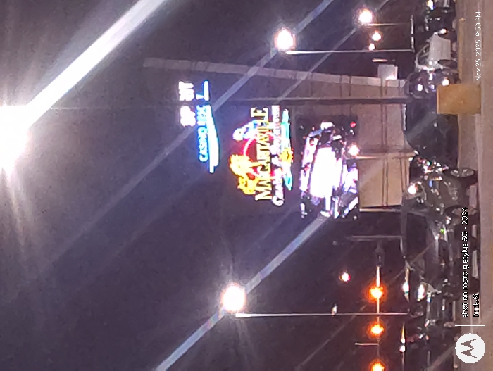 A night shot depicts the illuminated signs of the "Casino del Sol" and "MARGARITAVILLE." The camera phone details read "shot on moto g stylus 5G - 2024" and "Nov 25, 2025, 9:53 PM" on the right side. Streetlights and parked cars line the background, suggesting a casino parking area.