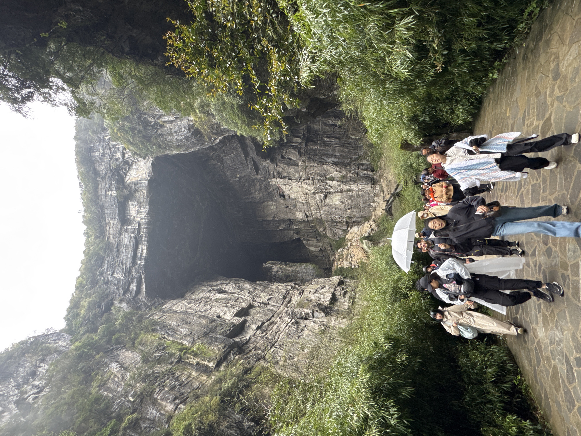 A landscape-oriented photograph depicts a natural scene with geological features and a group of people. The main element is a large, open cavern entrance formed within a cliff face. The cliffs appear to be composed of layered rock, partially covered with greenery. To the right side of the image, there is a paved pathway along which a group of people is standing. The individuals seem to be tourists or visitors. Some are holding an umbrella, and some appear to be posing for a photograph. Based on visual information and the reference to Wulong District, China, the scene is likely located in the Three Natural Bridges area.