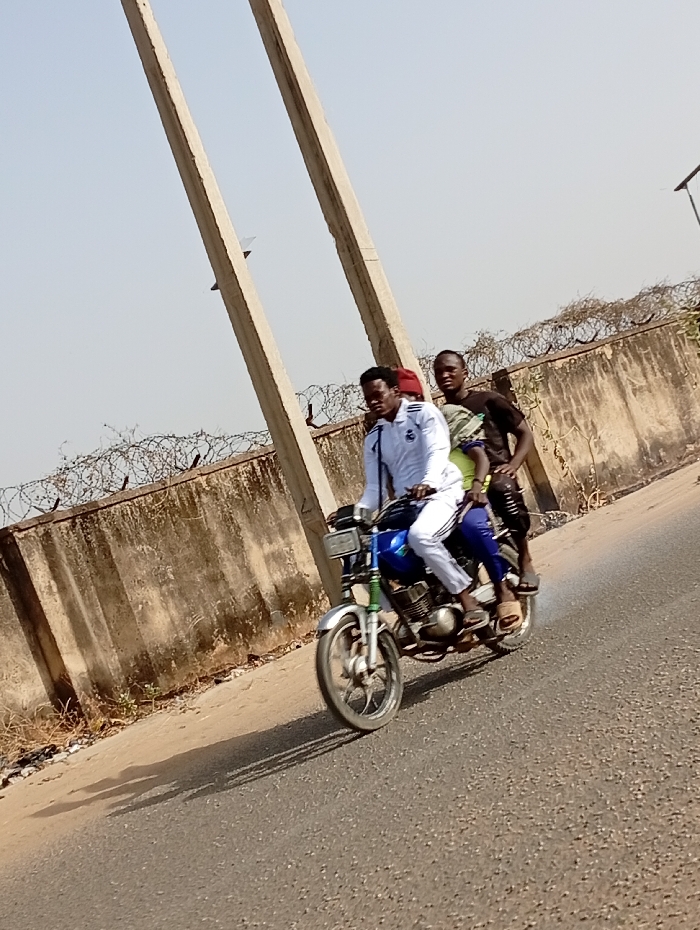 - "Three male individuals are observed riding a blue motorcycle on a paved road in Aviation Quarters, Nigeria, under a hazy sky" by FM-asM423, licensed under CC BY 4.0