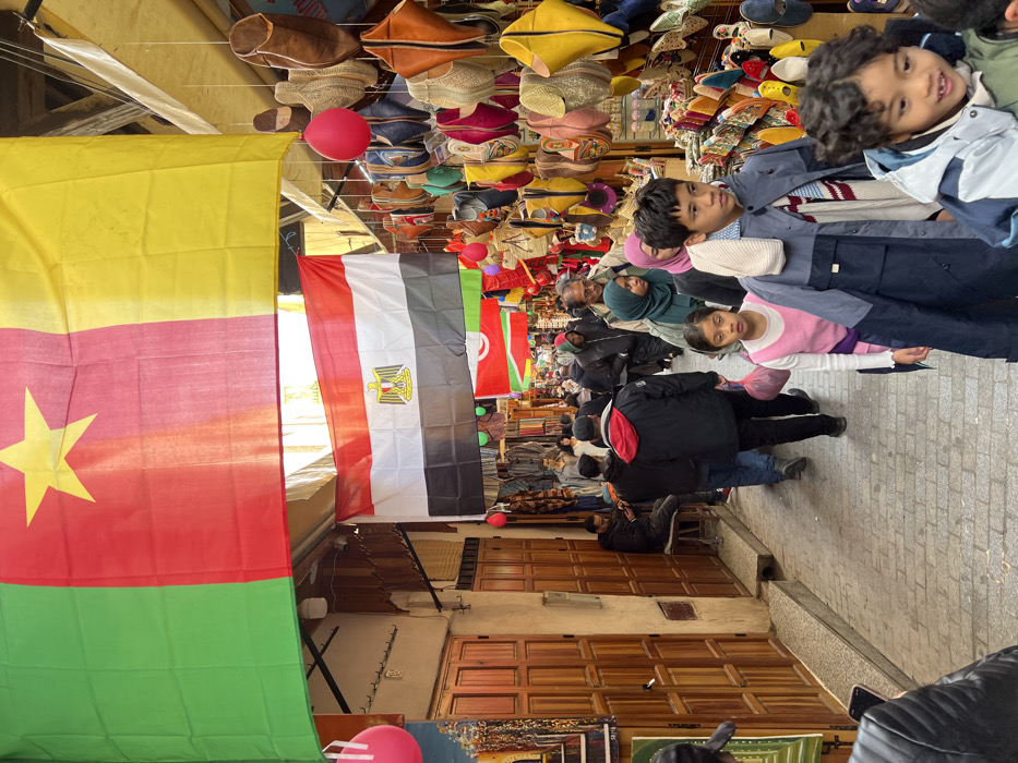 This image depicts a bustling, narrow alleyway within a souk in Fez, Morocco. Overhead, large fabric flags are prominently displayed: the flag of Cameroon (green, red, yellow vertical stripes with a yellow star) hangs highest, followed by the flag of Egypt (red, white, black horizontal stripes with the Golden Eagle of Saladin). A third flag, partially visible deeper in the alley, shows green, red, and white elements. Red spherical decorations are also suspended across the alley. The cobblestone pavement is densely populated with individuals of varying ages and apparent local ethnicity. On the right side of the alley, numerous market stalls are visible, heavily laden with colorful traditional Moroccan babouches (slippers) of various designs and hues, hanging from overhead structures and displayed on shelves. The left side features closed multi-paneled wooden doors and some smaller product displays. In the immediate foreground, three children are present: a boy in a blue jacket draped over his arm and a striped sweater, a girl in a pink top positioned behind him, and a younger child partially visible, smiling towards the viewer. In the midground, a diverse crowd of pedestrians fills the passage, including a woman wearing a green hijab and a man in a black jacket with a red-lined hood walking away. On the left midground, a man sits on a wooden stool, actively looking at a mobile phone. Further into the background, additional market stalls with merchandise and more pedestrians extend down the illuminated passage.