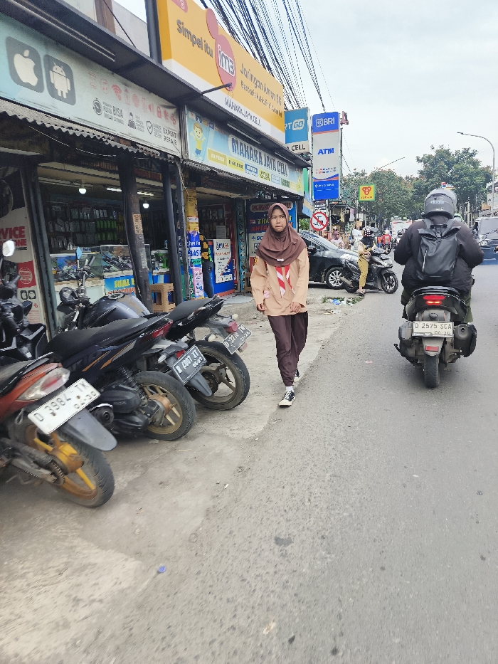 This image captures a daytime urban street scene in Cimahi, Indonesia, under an overcast sky. In the foreground, a paved asphalt road runs parallel to a concrete sidewalk. A young female, appearing to be a teenager, is walking on the sidewalk towards the left of the frame. She wears a light brown long-sleeved top with a dark brown collar and sash, a dark brown headscarf (hijab), dark brown trousers, and black-and-white canvas sneakers. Her gaze is directed forward. Immediately to her left, five motorcycles are parked angled towards the sidewalk. Visible license plates include 'D 3984 TK' on a red-orange scooter and 'D 4207 TT' on a black motorcycle. A single blue plastic bottle cap rests on the concrete near the parked vehicles. On the asphalt road to the right of the walking female, a person wearing a black helmet and a black backpack rides a black scooter, moving away from the viewer. The scooter's license plate, 'D 2575 SCA', is visible. The background reveals a row of single-story commercial buildings lining the street. A prominent yellow sign for "IM3 Jaringan Aman 5G" is displayed above a storefront. Below it, the business "MAHARA JAYA CELL" is identified, featuring logos for Apple and Android, and text indicating phone service and expert repair. Further down the street, a blue and white "BRI ATM" sign is visible. Overhead, numerous black utility lines crisscross the sky. In the mid-ground, a black car is parked alongside the road, and another individual is visible standing near a scooter. A blue circular 'no parking' sign is present on the right side of the street. Trees and additional indistinct figures are visible further down the street.