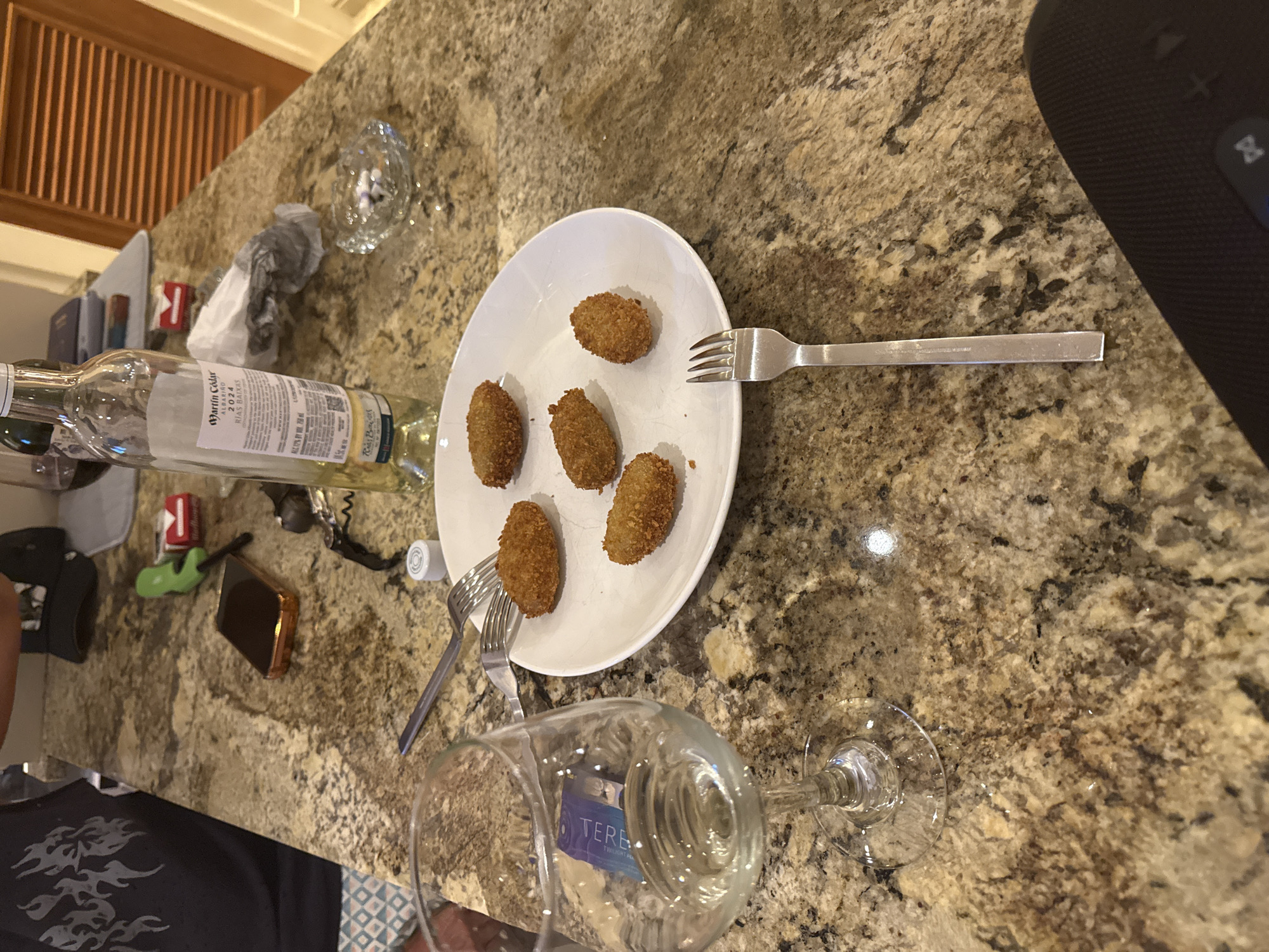The scene depicts a kitchen or bar counter in a residential or hotel setting in Miami Beach, United States of America. The counter surface is made of speckled brown and beige granite. In the center, a white oval plate holds five golden-brown, breaded, oval-shaped food items, consistent with croquettes or similar fried appetizers. A silver-colored fork rests partially on the plate, with another similar fork lying on the counter to the right. To the left, a clear stemmed wine glass, containing a pale yellow liquid (likely white wine) and a blue card with "TERR" visible, stands on the counter. Above the plate, an almost empty clear glass bottle of "Martín Códax" Albariño white wine (Vintage 2024, Rías Baixas) is positioned. Clustered on the counter behind the wine bottle are a green disposable lighter, two red and white cigarette packs (identified as Marlboro Menthol), and a crumpled white paper napkin or tissue. To the right of these items, a clear glass ashtray contains multiple cigarette butts and ash. A black-handled corkscrew is visible near the wine bottle. A small white plastic bottle cap rests on the counter between the forks. A dark-colored smartphone with a reflective copper-colored case is face down on the granite surface. Further back, a black baseball cap is placed upside down. A person is partially visible on the far left, wearing a dark short-sleeved shirt with a light-colored, flame-like or tribal design on the shoulder. Below the shirt, light-colored shorts with a geometric diamond pattern are visible. In the background, a wooden louvered door or cabinet is present. In the bottom right corner, a portion of a black portable Bluetooth speaker with control buttons is visible.