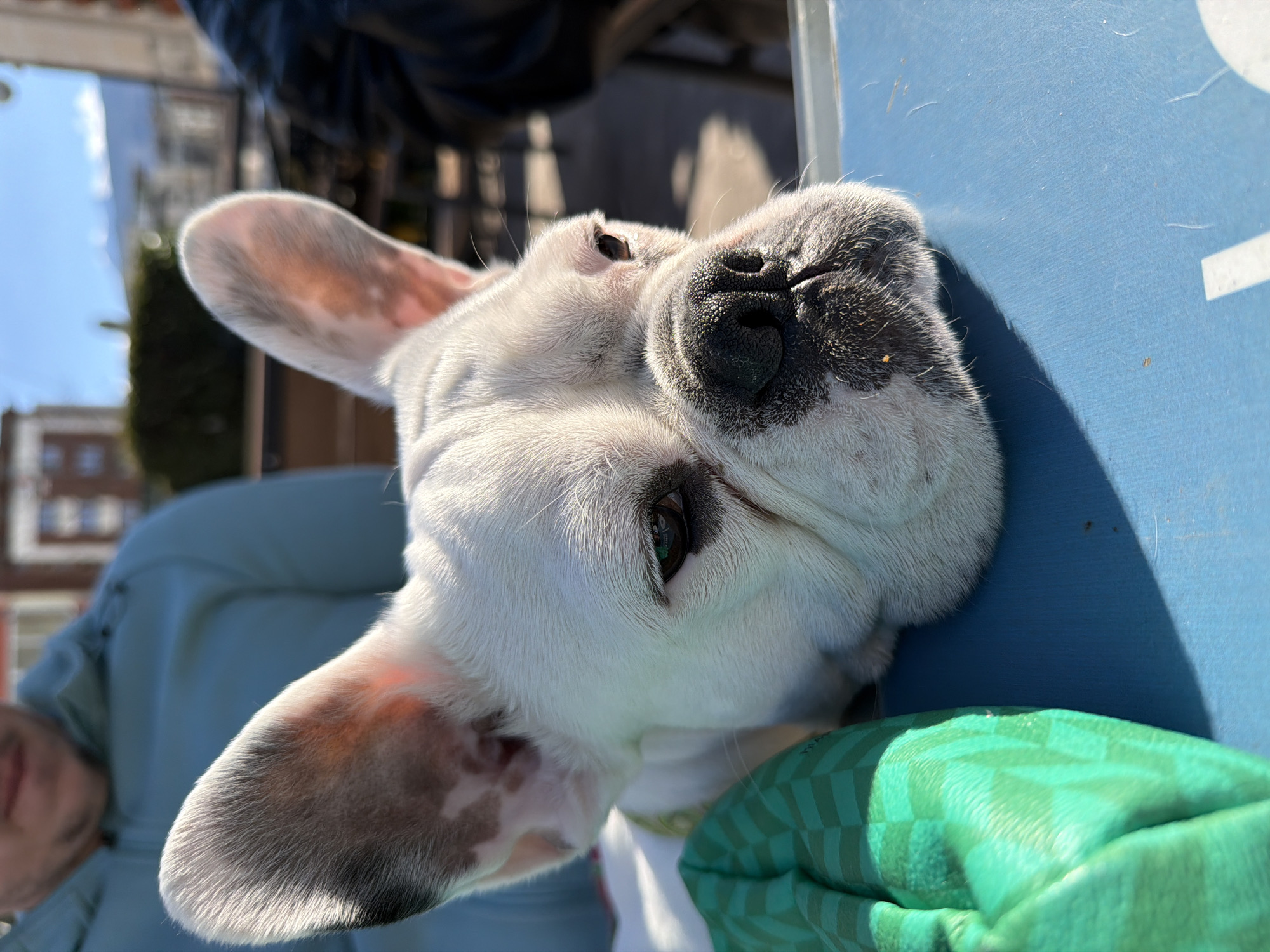 white French Bulldog lying on a light blue surface, possibly a table, outdoors. The dog has one ear visible on the left side of the frame and a wrinkled face with a black nose. A green checkered item is visible near the dog's lower neck. In the background, a blurry urban landscape is present, including a building with orange bricks and a tree, implying an urban setting. A person wearing a light blue jacket is partially visible on the left side. Based on the architectural style and general appearance, the location may be Sofia, Bulgaria.