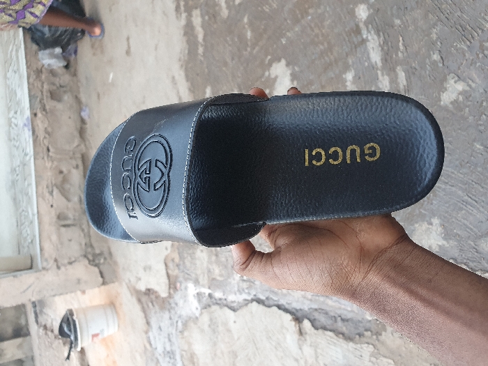 A dark-skinned left hand holds a single black slide sandal vertically. The sandal's strap features an embossed "GUCCI" text and interlocking "GG" logo with white stitching. The footbed displays "GUCCI" in gold lettering. The scene is an outdoor, brightly lit urban environment in Lokoja, Nigeria. The background shows a mottled concrete ground surface. To the left, a white plastic bucket with a black lid contains dark material. To the right, a second individual's lower leg and foot, wearing an orange sandal and patterned clothing, are partially visible next to a black plastic bag. A light-colored concrete step or foundation is present behind the bucket and the second individual.