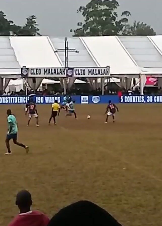 muddy field with players dressed in various-colored uniforms engaged in a soccer match. The players are running across the field and kicking a soccer ball. Spectators are visible at the lower edge of the video and behind the field, while a large white tent with signage reading "CLEO MALALAH" can be seen in the background. The weather appears overcast and dull.