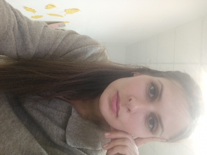 A female subject is depicted in a close-up, chest-up portrait. She has long, straight, dark brown hair, partially pulled back, revealing small silver-colored hoop earrings in both ears. Her complexion is fair, and she has dark eyes. A small stud piercing is visible in her right nostril, and her lips are light pink. She maintains a neutral expression, looking directly at the camera. Her left hand is raised, with fingers resting against her temple area. She is wearing a light grey, textured, collared garment, possibly a sweater or jacket, with a thin gold-colored necklace visible around her neck. The background consists of a plain white wall to the left, adorned with several yellow leaf-shaped cutouts. A white suspended ceiling with visible grid lines is partially visible at the top of the frame. The lighting is bright, causing a slight lens flare in the upper central portion of the image. The specific location within the city of Irkutsk, Russia, cannot be determined from the visual information provided in the image.