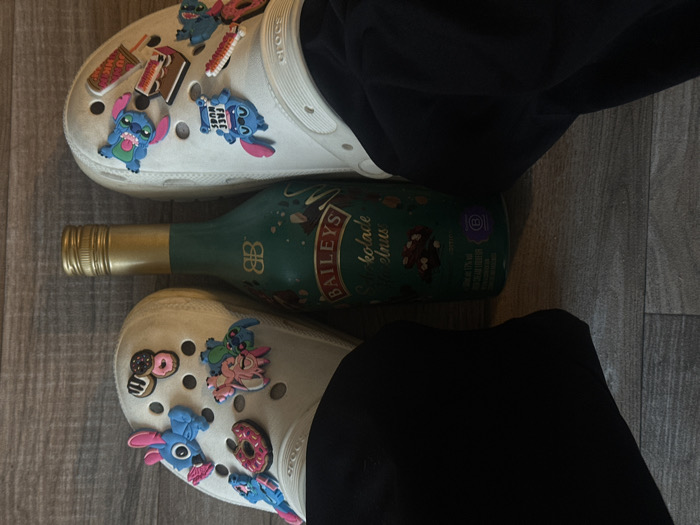 An overhead view captures two feet, clad in black trousers and white Crocs brand clogs, resting on a light brown wooden floor with visible grain. A dark green bottle of Baileys Irish Cream Liqueur, identified by its label as "Chokolade Nuss" (Chocolate Nut) flavor, is positioned horizontally between the two shoes. The bottle features a gold-colored, ribbed screw cap and the "BAILEYS" logo. The top Croc is adorned with multiple Jibbitz charms, including two blue Stitch characters and two donut designs. The bottom Croc also displays various Jibbitz charms, including three blue Stitch characters (one holding a "FREE HUGS" sign) and several dessert-themed items such as a cake slice, an ice cream bar, and a waffle cone. The scene is located in the city of Essen, Germany.