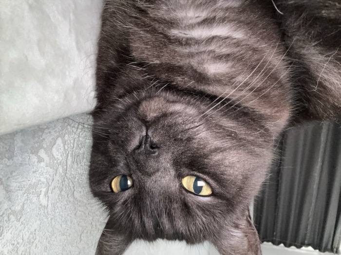 An upside-down close-up reveals a grey tabby cat's face