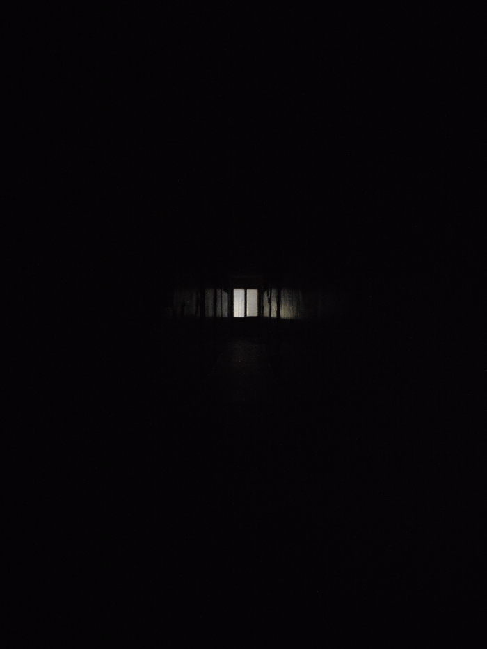 The image depicts a predominantly dark scene with a single, brightly illuminated rectangular object centered horizontally, slightly above the vertical midpoint. This object appears to be a window or doorway, exhibiting two main vertical panes separated by a narrower central vertical divider, emitting a stark white light. Faint, dark architectural structures, possibly walls or pillars, are dimly discernible on either side of the illuminated rectangle, extending into the surrounding darkness. A low-contrast, flat surface, consistent with a floor or ground, leads toward the light source. The overall environment is obscured by extreme darkness, indicating night conditions or an interior space with minimal ambient light. No individuals, explicit actions, or additional discernible objects are present. This scene is located in the city of Chaikovsky, Russia.