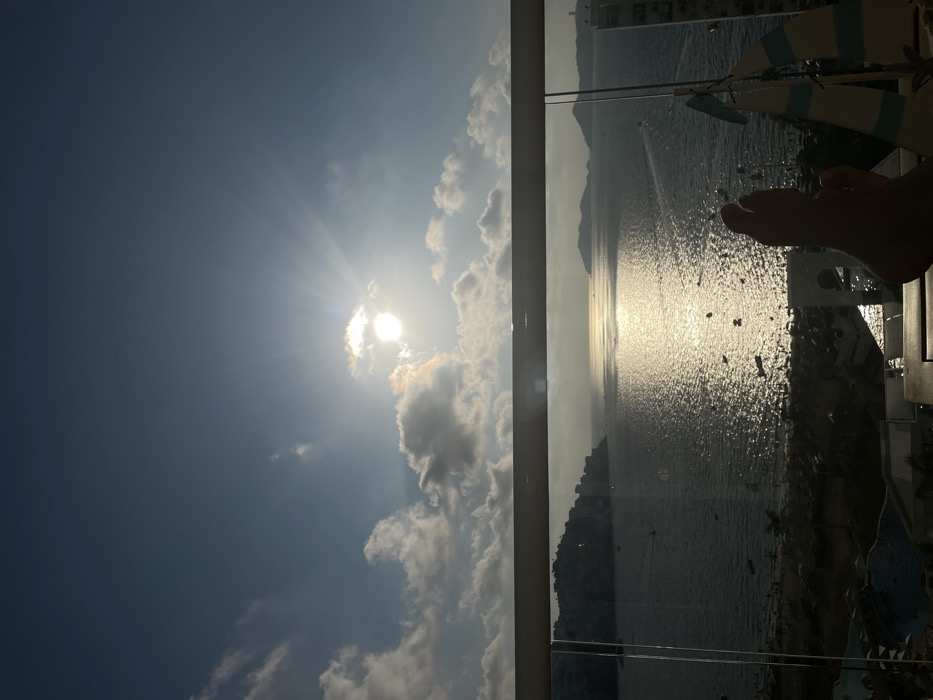 A sunny sky with scattered clouds contrasts against a shimmering body of water, possibly a sea or ocean, reflecting sunlight. A rocky landmass or coastline is visible in the distance. A balcony railing frames the view, and a portion of a foot is visible in the upper right corner, suggesting a person enjoying the scene.