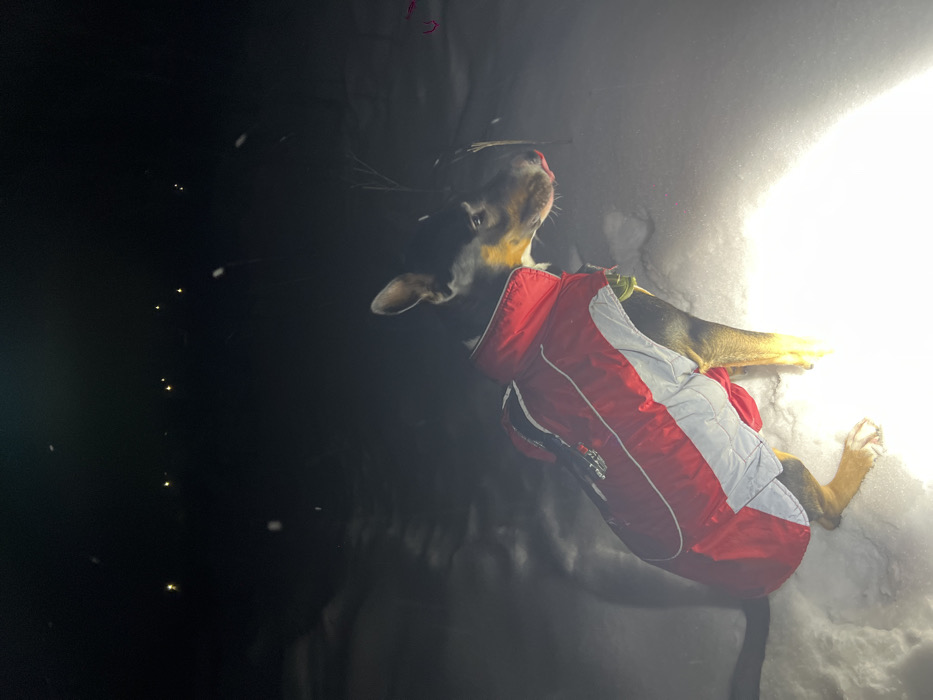 A dog in a red and white jacket is lying in the snow. The dog is predominantly black and tan, with its head tilted upwards. The background is dark, but a bright light source illuminates the area around the dog and the snow. The scene appears to be at night, with small specks, possibly snowflakes, visible in the dark area. The dog's coat is clearly visible against the white snow.