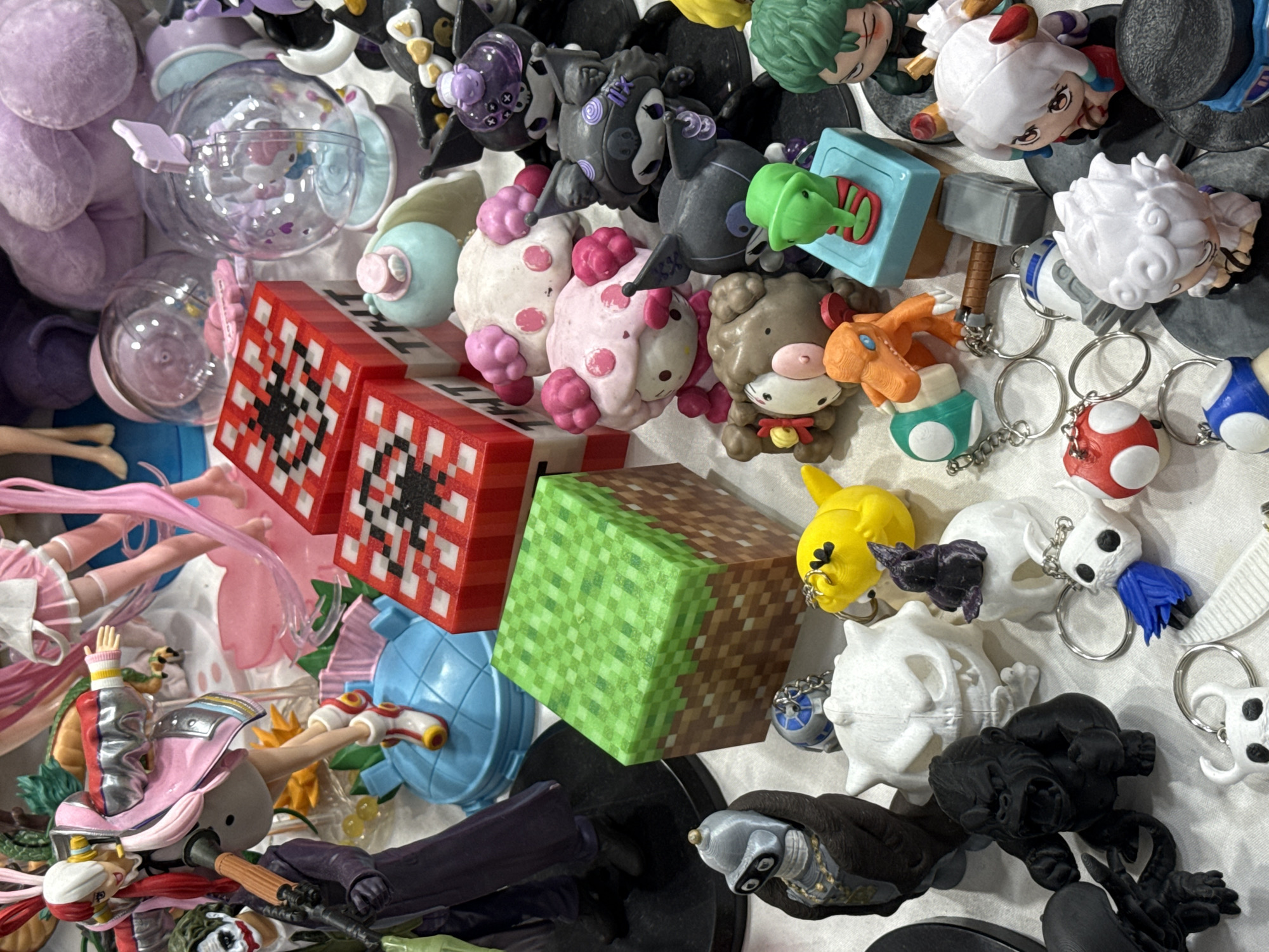 A cluttered assortment of figurines, toys, and keychains are densely packed on a white surface. Among the items are two red Minecraft TNT blocks, a green Minecraft dirt block, several Japanese anime-style figures, plush toys, and a variety of character keychains including those resembling mushrooms, ghosts, and other creatures. The scene shows no people or interactions. The environment is a cluttered surface. The location of Cholula, Mexico is not evident in the visual data.