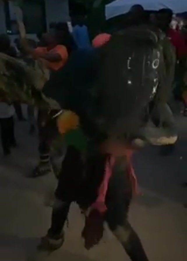 The video depicts two figures in traditional costumes dancing in a public space at dusk. Both are dressed in black and are adorned with colorful fringes and coverings. The figure in the foreground has a dark, translucent head covering, appearing to be a mask. A crowd of onlookers surrounds them, with a white tent and a building visible in the background. One of the figures holds a leafy branch, moving it rhythmically with the dance. The atmosphere is lively, with people cheering and creating sounds of celebration.