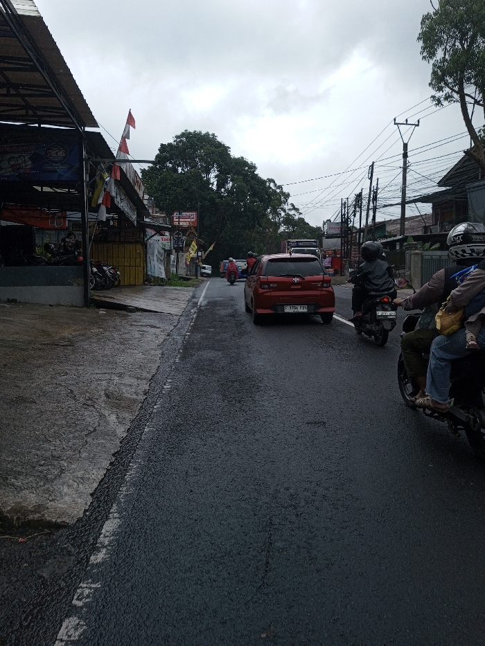 The image displays an overcast daytime street scene with a wet asphalt road and adjacent concrete sidewalk, indicating recent precipitation. The location is the city of YonPhoogla, Bhutan. On the immediate left, a covered structure with a dark metal roof is open to the street. Beneath this shelter, blue and red banners are visible, and several motorcycles are parked. Red and white flags are affixed to poles and lines extending from this structure. Further down the street, additional commercial buildings with various signs are visible, bordered by green foliage. The road features a faint, broken white line separating a shoulder or parking area from the main thoroughfare. Traffic is moving away from the viewer. In the right foreground, a person wearing a white and black helmet, a light-colored jacket, blue jeans, and sandals is operating a motorcycle. A small child in light-colored attire is secured in a carrier on the rider's back, and another individual is seated behind the operator. The motorcycle's license plate shows "F 2Y 4XX". Immediately to the left, a second person on a motorcycle is visible from behind, wearing a dark jacket and a dark helmet. Further down the road, a red compact hatchback, identified as a Toyota Agya or similar model, travels away from the viewer. Its rear license plate reads "F 1704 FJV". Beyond this vehicle, additional motorcycles and a larger, obscured vehicle are visible in the distance, proceeding along the road. Utility poles and overhead wires line the right side of the street, which recedes into dense trees and buildings under the overcast sky.