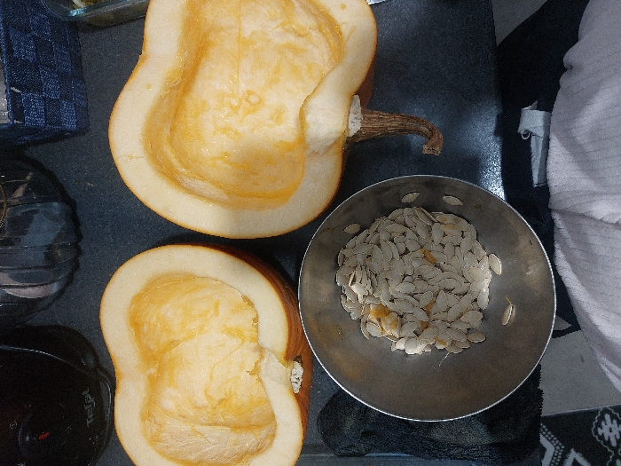 - "A halved pumpkin reveals its orange flesh, with seeds collected in a metal bowl beside it" by FM-gCkm43, licensed under CC BY 4.0