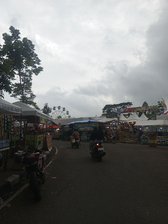 The image displays an outdoor market or fairground scene under a heavily overcast sky with dark grey clouds. An asphalt road, damp in appearance, curves through the center, leading into the background. In the lower left foreground, a red sportbike is parked facing away from the camera on a raised curb. Two motorcycles are in motion on the road, heading away from the viewer. The closer motorcycle carries two riders, while the one ahead carries a single rider with a large bundle strapped to the rear. Temporary market stalls with white and blue canopies line both sides of the road. On the left, a stall with a white canopy has packaged goods hanging from it, and a sign partially visible reads "GADOOG KEC. PACET." Another stall further along on the right features a blue canopy with a sign stating "MIE BASO AJU." In the mid-background, a green and yellow Ferris wheel rises above the stalls and trees. A large banner spans an elevated area in the background, displaying text including "Keluarga & Bazaar Umka" in Indonesian. Numerous individuals are visible interacting near the market stalls. Tall, dense green trees are scattered throughout the environment, particularly on the left and in the background. The visible text suggests a location in Indonesia.