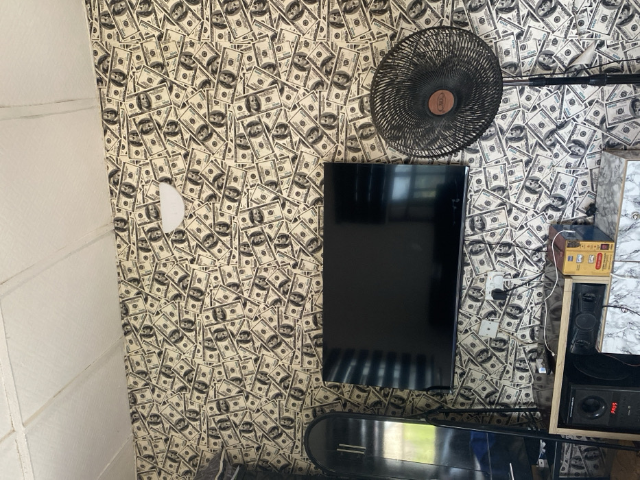 The image depicts an interior room in Adonkolo, Nigeria. The walls are covered entirely with wallpaper featuring a repeating pattern of U.S. $100 bills. A white, paneled ceiling is visible at the top. A white, semi-circular wall-mounted light fixture is affixed to the patterned wall in the upper-right quadrant. A large, dark, flat-screen television is wall-mounted centrally on the patterned wall. To the right of the television stands a black pedestal fan with a circular mesh guard. Below the television, an entertainment unit with a light-colored, possibly marble-patterned top surface is visible. On this unit, a black speaker system, displaying a red digital readout of "05", is positioned on the left. To its right, a brown cardboard box with red and white labeling and a blue container are present. White electrical outlets and various cables are visible on the wall directly beneath the television. A tall, dark, reflective wardrobe or cabinet is partially visible on the far left, reflecting a window view featuring green outdoor foliage. No individuals are present in the scene.