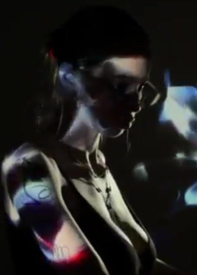 woman in a dark environment. She is wearing glasses and several necklaces and has tattoos on her left arm. She appears to be lit by a projector displaying abstract light patterns on her face and upper body. The background is uniformly dark, and there are no other objects or people visible.
