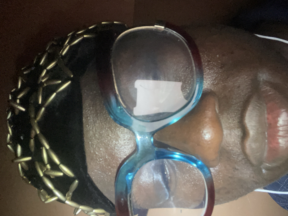 A close-up, head-and-shoulders portrait depicts an individual with dark skin. The person wears a dark, possibly velvet, headpiece adorned with numerous elongated, gold-colored beads or metallic embellishments. Large, oversized eyeglasses with thick, gradient frames transitioning from teal/blue to a darker hue (possibly maroon) cover the eyes. Reflections are visible on the lenses, including a prominent rectangular shape on the right lens. White wired earbuds are visible extending from below the chin. A dark shirt, possibly blue with a subtle patterned texture, is visible at the collar area. The background is a plain, dark brown surface, indicative of an indoor setting. The specific location within the city of Mosafejaw, Nigeria, cannot be determined from the visual information presented in the image.