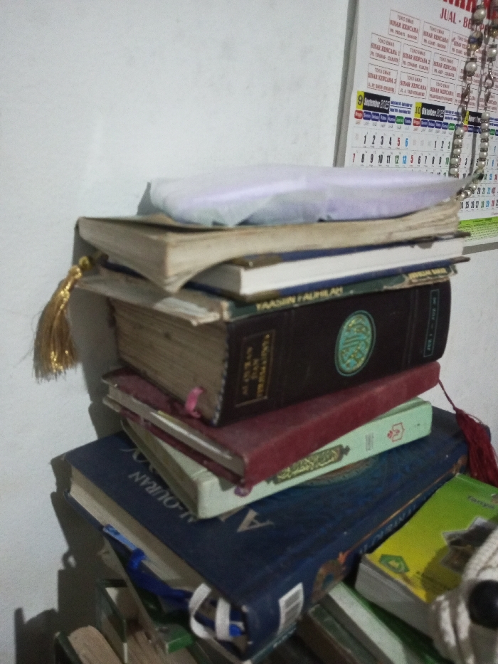 A stack of religious books, including copies of the Quran, is seen in the image. One book has "YAASIIN HAUHILAN" printed on its spine. The books vary in color, with blue, red, and dark brown covers visible. A gold tassel hangs from one of the books. A calendar is partially visible in the background, showing September and October. The word "JUAL" is partially visible on the calendar. A string of beads is hanging from the calendar.
