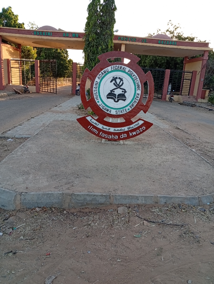 The image features the entrance to Hussaini Adamu Federal Polytechnic in Kazaure, Jigawa State