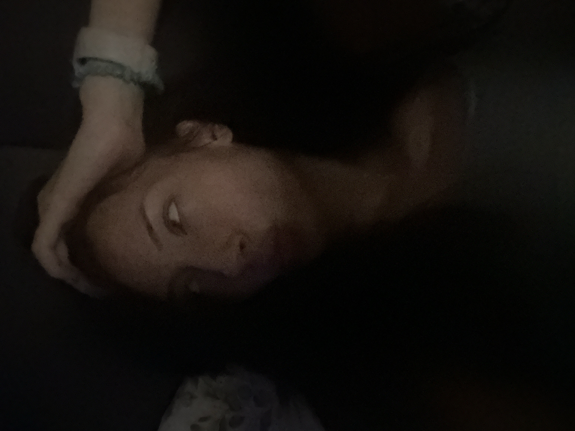 A dimly lit close-up photograph shows a person's face tilted towards the camera, resting against a dark surface