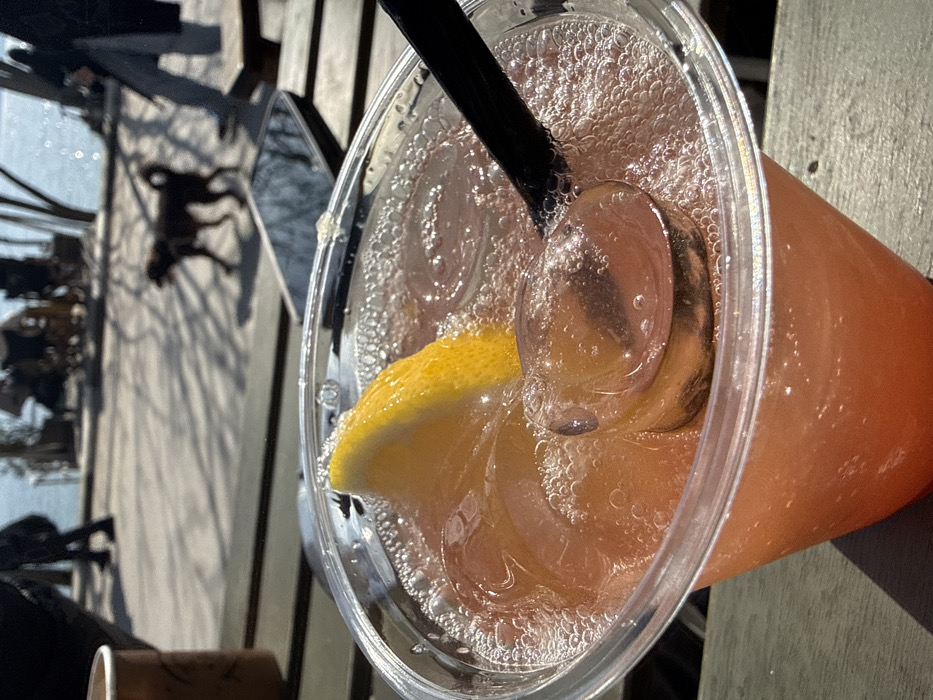 The image displays a clear plastic cup containing a reddish-orange carbonated beverage with multiple ice cubes and a yellow lemon wedge. A black plastic straw is inserted into the drink. The cup rests on a horizontal surface composed of greyish-brown wooden planks. To the right of the cup, a black smartphone is visible lying face down on the wooden surface, reflecting light. The background, out of focus, reveals an outdoor scene under bright sunlight. A paved pedestrian area is visible, traversed by a dark-colored, medium-sized dog walking from left to right. Several blurred human figures are also present, some walking and others seated at distant tables. Beyond the paved area, a body of water is discernible, consistent with the Black Sea. The setting is identified as an outdoor cafe or leisure area within the Sea Garden (Morska Gradina) in Varna, Bulgaria, bordering the coastline. Distinct shadows from unseen objects or vegetation are cast across the paved ground, indicating strong overhead illumination.