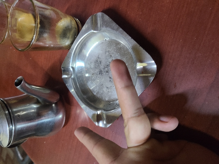 The image displays a tabletop scene in the city of Fez, Morocco. In the lower-left foreground, a human left hand is positioned, with the index and middle fingers extended upwards in a V-sign, while the remaining fingers are curled. Centrally located is a square, silver-toned metal ashtray containing dark grey ash and particulate debris. To the upper-left, a small, silver-toned metal teapot with a lid and spout is present. In the upper-right background, two clear glass cups are visible; the closer cup exhibits a dark liquid residue at its base. All depicted objects rest on a smooth, reddish-brown wooden surface, likely a table.