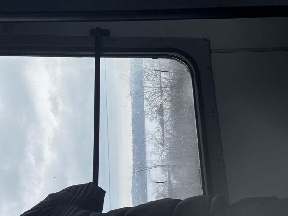 The scene depicts a view from inside a vehicle, likely a train or bus, looking out a window over a body of water in Topoli, Bulgaria, under an overcast sky. On the far left, the upper left shoulder and arm of an individual, dressed in a dark, possibly padded jacket, are visible. A horizontal dark metal bar extends across the upper section of the window, secured to the right side of the window frame. The rectangular window itself features a rounded top-right and bottom-right corner and appears somewhat dirty or smudged, with a distinct small, vertical red mark near its lower-center. Beyond the window, the immediate foreground features a cluster of bare, deciduous trees with intricate dark branches, indicative of winter or early spring. Behind these trees, a calm expanse of water, likely a lake or large river, stretches horizontally across the mid-distance. The far side of the water reveals a distant landmass with a faint, low-lying horizon and indistinct structures, possibly buildings, suggesting a populated area. The sky above is entirely overcast with a uniform layer of light gray clouds. The interior of the vehicle shows light gray paneling below the window and a dark vertical frame element on the far right. No explicit actions or interactions are depicted beyond the static observation of the exterior landscape.