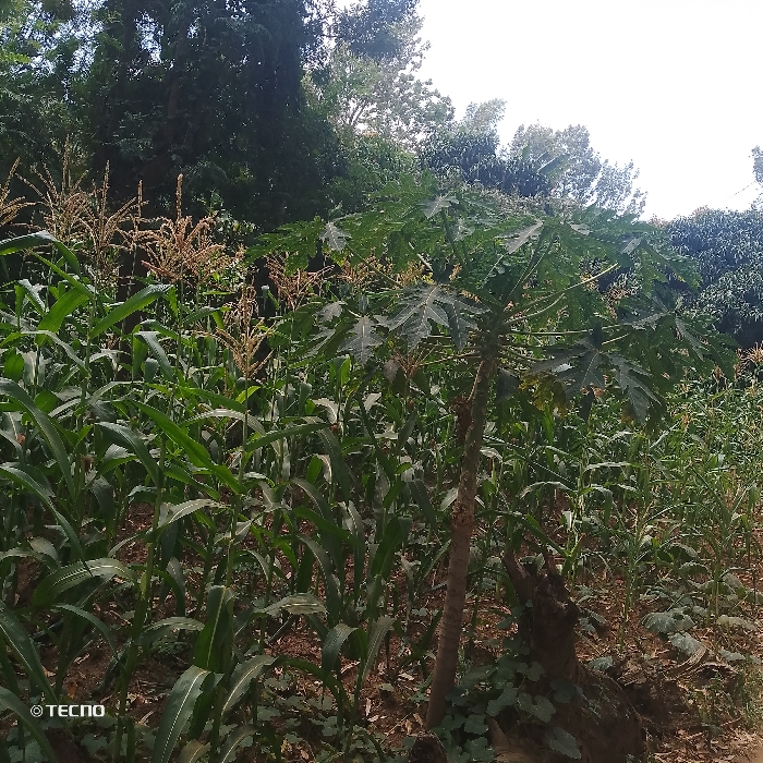 The image displays an outdoor agricultural scene within Machakos Central ward, Kenya. The foreground and mid-ground are densely populated with green maize (corn) plants, many of which exhibit mature, light-brown tassels. A prominent papaya tree, characterized by its slender trunk and large, dark green, deeply lobed leaves, stands slightly right of center in the mid-ground. Trailing green vegetation is visible on the reddish-brown soil at the base of the papaya tree. In the background, a dense, verdant expanse of various trees and foliage is present, capped by a bright, light-colored sky that suggests overcast conditions or strong sunlight. No human figures or man-made structures are visible. A "TECNO" watermark is present in the lower-left corner of the image.
