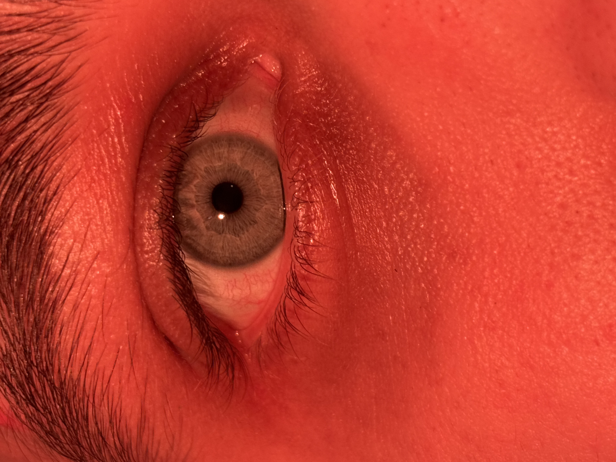 An extreme close-up of a human eye, with the iris appearing grey. Eyelashes are visible on both the upper and lower lids. The skin surrounding the eye has a reddish hue, as do the eyebrow hairs above. The image lacks any discernible context to determine a location, let alone a city in Russia. Therefore, no location information is possible.