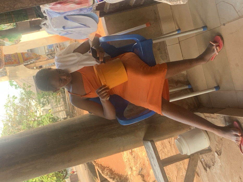 An adult female is depicted seated on a blue plastic chair within an open-fronted commercial establishment in Otuocha, Nigeria