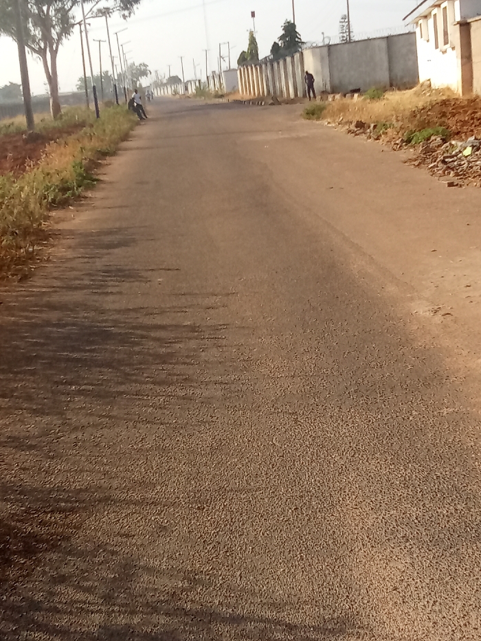 This image captures a straight, two-lane asphalt road in Barikin Jirga Summa, Nigeria, under bright daylight conditions
