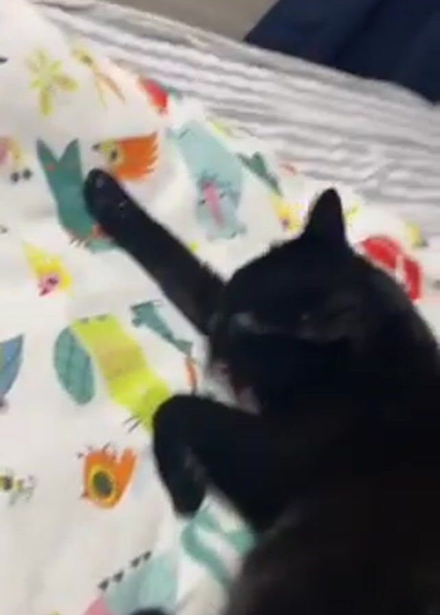 A black cat is lying on a bed with a colorful patterned sheet. The cat extends its right arm and licks its paw several times. The sheet has illustrations of owls, fish, and other animals. The head of the bed is navy blue and white.