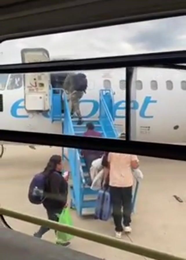 people boarding a white and blue aircraft named "ejet" via a blue stairway. Passengers are ascending the stairs towards the plane's open door, while others wait their turn, some carrying luggage or bags. An airport employee in a high-visibility vest stands near the stairs, and an orange traffic cone and a brown backpack are placed on the ground nearby. The view is captured through the window of another vehicle, with a metal frame visible. Beyond the plane, there are two large jet engines. The sky is overcast.