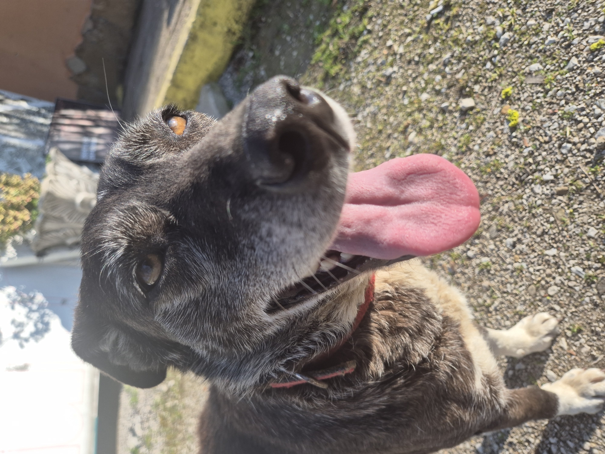 A close-up, low-angle, outdoor photograph shows a dog with black and gray fur, brown eyes, and a long pink tongue lolling out of its mouth. The dog wears a red collar. The background shows small pebbles and sparse vegetation, indicating a ground surface. Part of a building, possibly stucco, is visible in the upper-left corner. The image suggests the location is outdoors in a sunny area, but there are no identifiable landmarks to confirm it is Pavlikeni, Bulgaria.