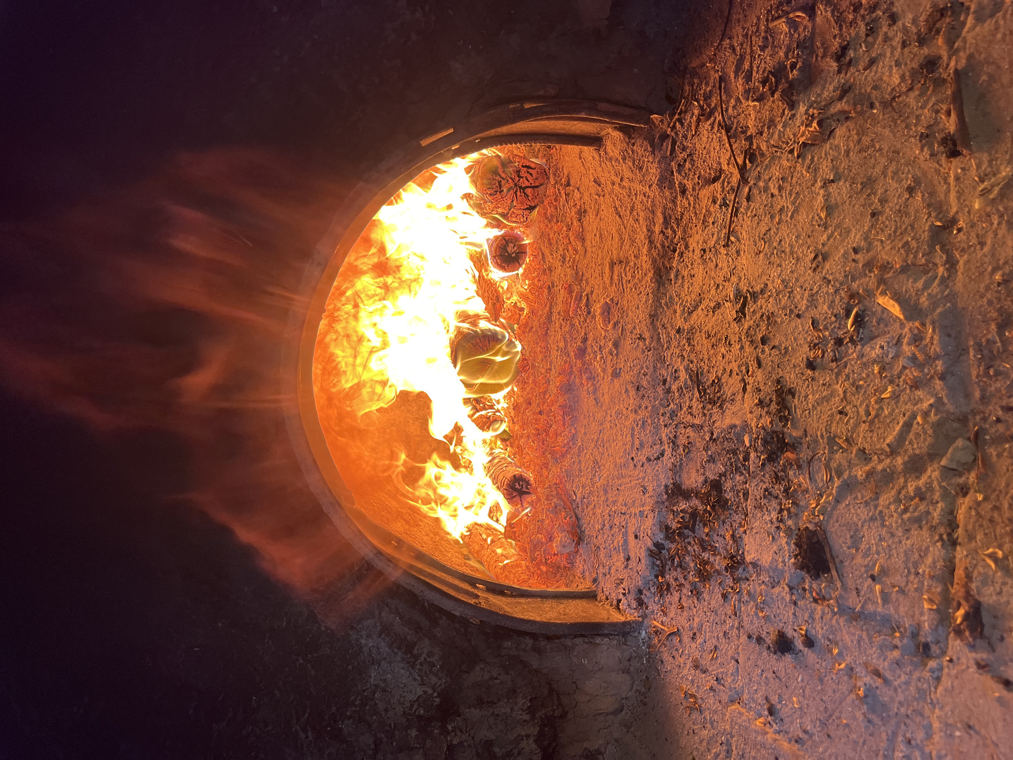 fire burning inside a cylindrical structure, possibly a kiln or oven