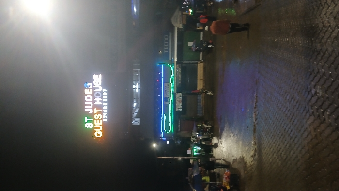 This image displays a nighttime street scene in Kisii Central ward, Kenya. The foreground consists of dark grey interlocking pavers, wet and reflective from recent moisture. In the mid-ground, a multi-story building dominates, featuring a prominent, brightly illuminated sign on its upper facade that reads "ST JUDES GUEST HOUSE" in multi-colored letters (green, orange, blue, white), with the contact number "0714301887" displayed below. Below this sign, a segment of the building exhibits horizontal blue and green neon strip lighting. A "TECNO" logo is visible on the building's facade to the right of the neon lights. At street level, on the far left, a person stands under a blue umbrella next to a street stall with items displayed in red containers. Several individuals are present on the wet pavement, including a figure wearing a light-colored cap and a brown-orange jacket, walking away from the camera towards the right side of the frame. Multiple motorcycles are visible, some stationary and others with riders. A bright streetlight on a pole emits a strong glow from the left side of the scene.