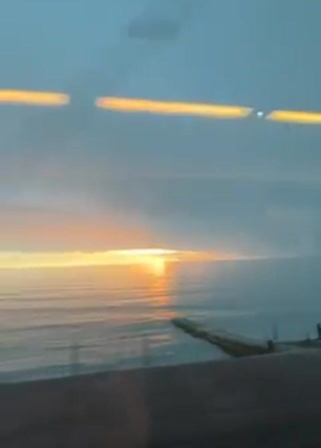 view from a moving train. Through the train window, a body of water stretches to the horizon, where the sun is setting or rising. The sky is a mix of blue and cloud cover. The sun is a bright spot reflecting on the water. A dock or structure extends into the water from the side of the train tracks. The train window reflects interior lights as horizontal lines. A voice announces the arrival at a station.