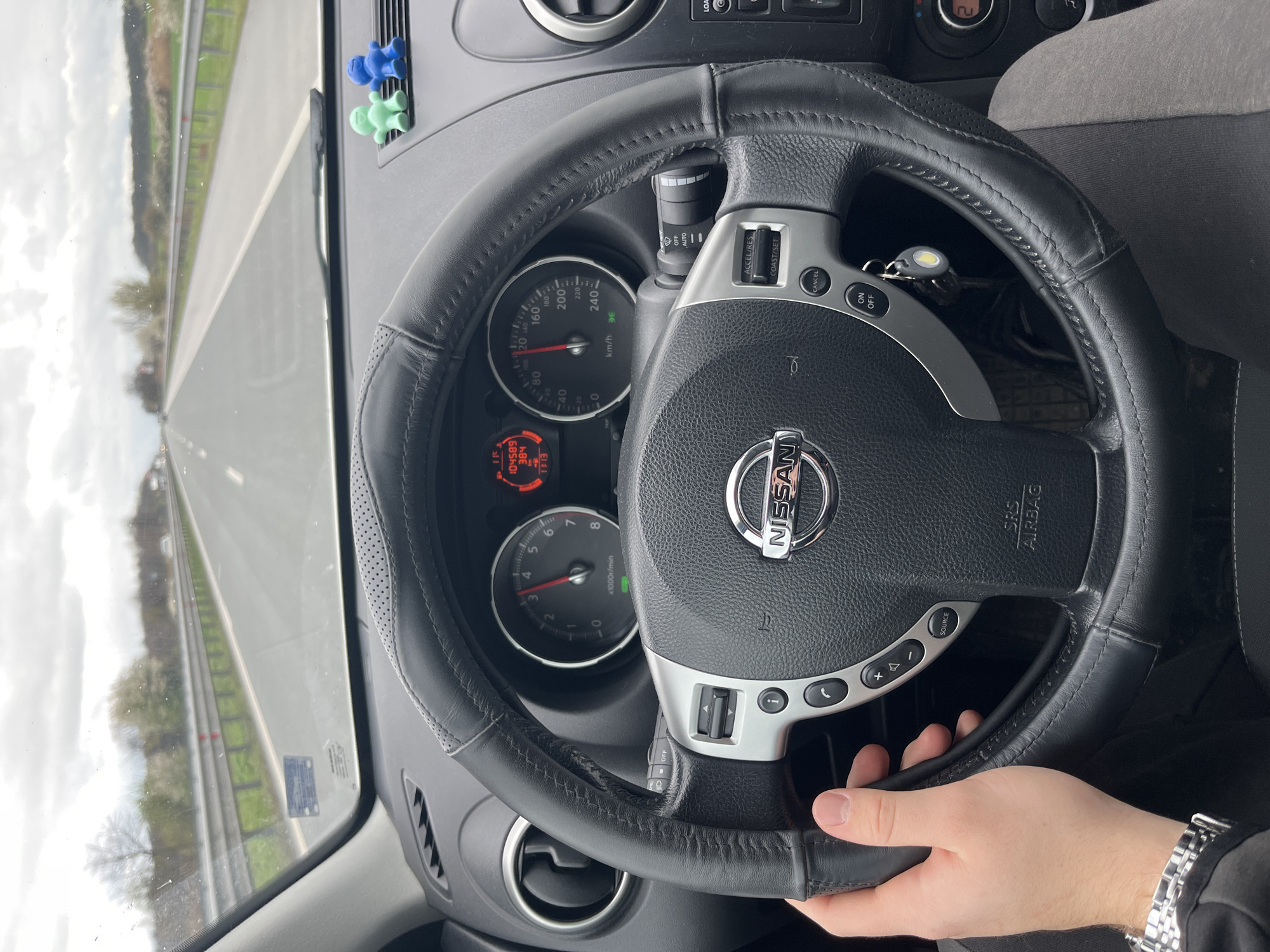 A view from inside a Nissan vehicle, the steering wheel prominently displayed with the Nissan logo at its center